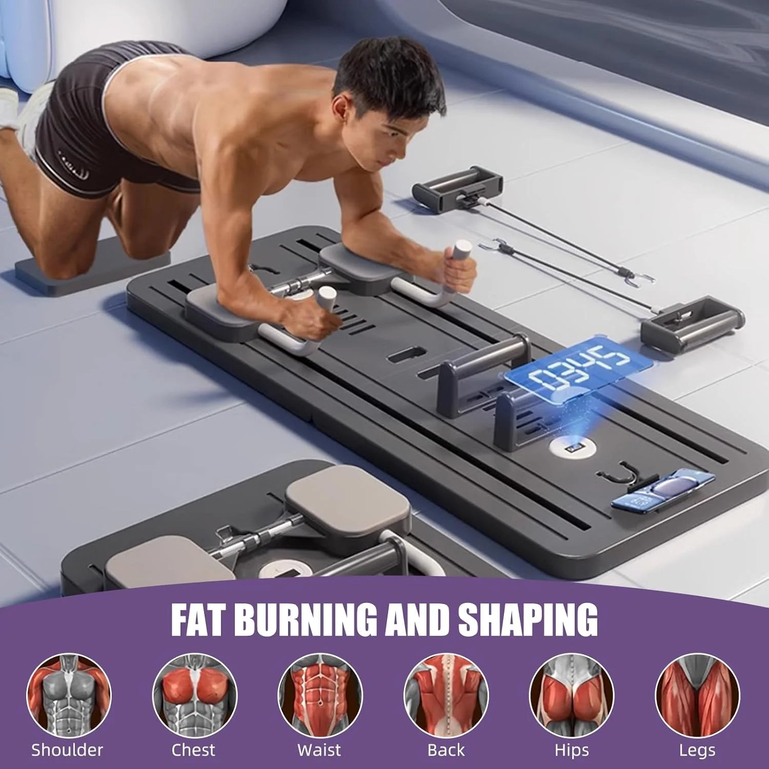 Elevate your home fitness routine with this Multifunctional Abdominal Exercise Push up Board 8-in-1 — a complete full-body workout system designed for both men and women. This versatile fitness board combines multiple training tools into one compact machine, allowing you to perform a wide range of exercises that target your core, chest, arms, back, glutes and legs all in one place. Its automatic rebound mechanism ensures fluid movement and smooth transitions on every rep, while smart timer control keeps you on track with your workout goals.